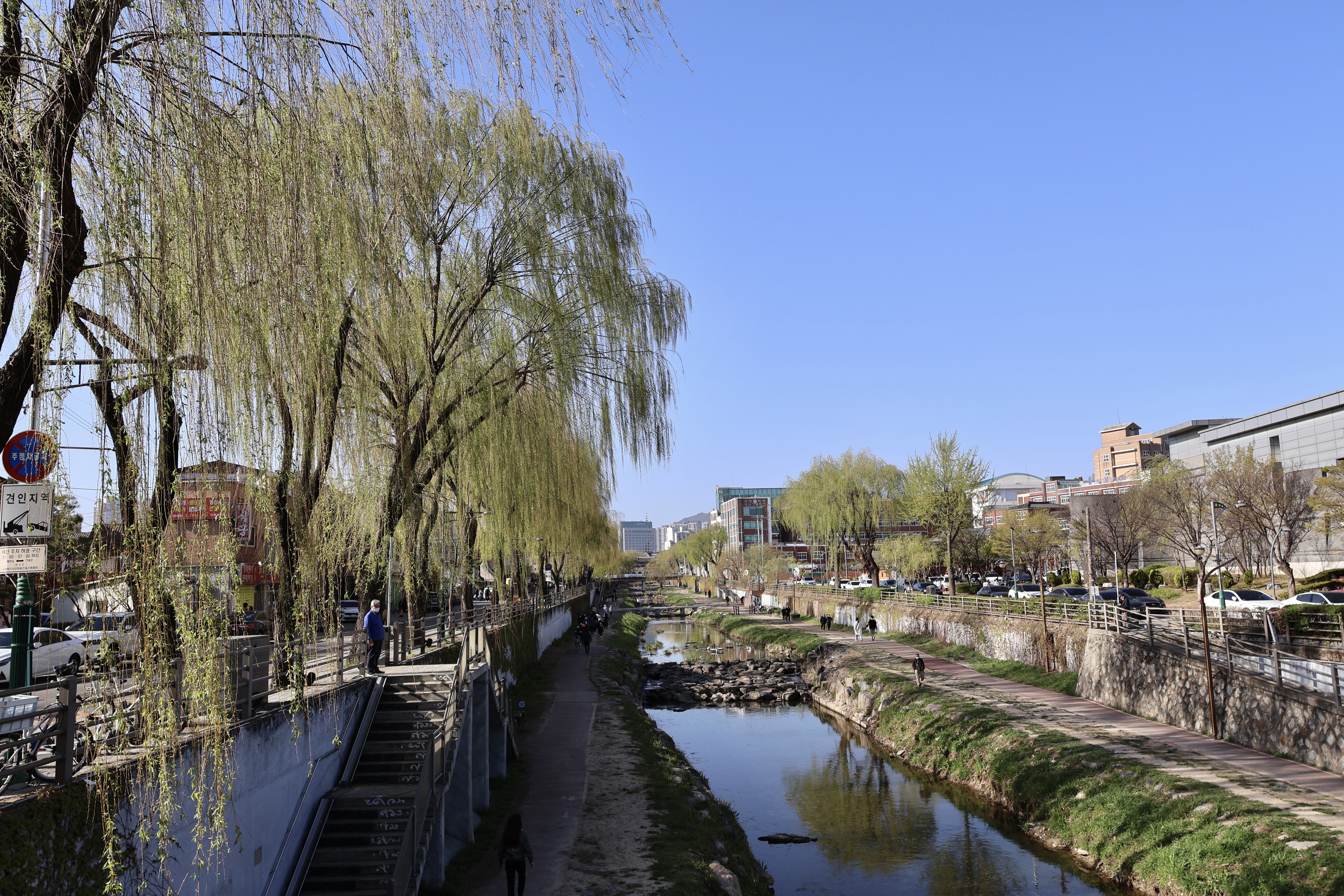 주차장에 차를 주차한 후 행궁까지 가는 길에는 수원천이 있는데, 이 수원천은 낮에도 밤에도 계속 이뻤다. 수원천에는 내가 귀신나무라고만 알고 있던 버드나무가 있다. 이 버드나무가 수원천만의 분위기를 완성시켜 주는 것 같다.